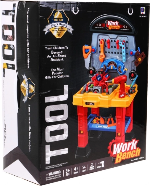 Die Kinderwerkstatt mit Motor bietet eine große Auswahl an Werkzeugen, die manuelle Geschicklichkeit, Vorstellungsvermögen und Kreativität Ihres Kindes ideal fördern. Zum Set gehört ein batteriebetriebener Motor mit realistischen Geräuschen und Lichteffekten, der jeden kleinen Enthusiasten begeistert.