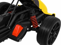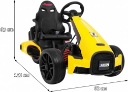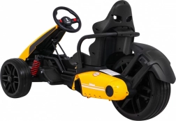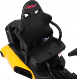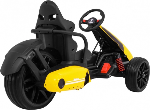 Für Komfort und sichere Kontrolle sorgen die verstellbare Lenkradhöhe, der sportlich profilierte Sitz mit Metallverstärkung sowie die unabhängige Vorderradfederung mit hinteren Stoßdämpfern. Zwei Geschwindigkeiten (Quick/Slow) erlauben die Anpassung an die Erfahrung des Kindes, und die Hupe im Lenkrad sorgt für ein realistisches Erlebnis.