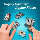 Erschaffen Sie zu Hause ein imposantes Modell der Burg Camelot mit Türmen, Zinnen und Fahnen. Dank Spezialmaterial und präziser Formgebung der Teile hält das Modell fest ohne Klebstoff oder Werkzeuge. Der Zusammenbau erfolgt anhand übersichtlicher Referenzbilder und einer schwarz-weißen, illustrierten Anleitung.