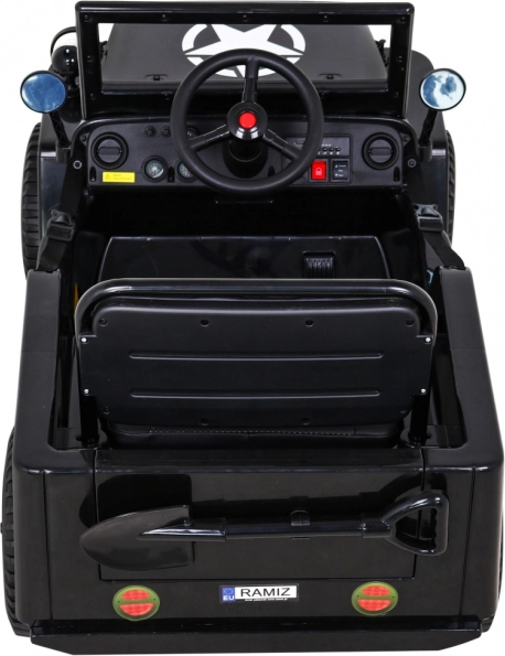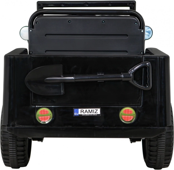 Eltern schätzen die 2,4‑GHz-Fernbedienung mit drei Geschwindigkeiten und dem Sicherheitstaster Stop. Kinder freuen sich über das Audio-Panel mit MP3/USB/Bluetooth, die Hupe im Lenkrad und die effektvollen vorderen LED-Lichter mit eigenem Schalter. Praktische Staufächer vorne und hinten bieten Platz für Kleinigkeiten, und die beiliegende dekorative Schaufel unterstreicht den militärischen Charakter.