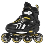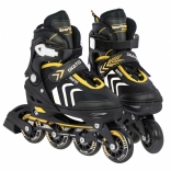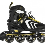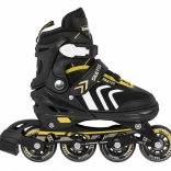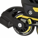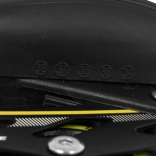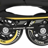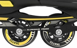 Der Schuh verfügt über effektive Belüftung, eine semipermeable Membran und eine profilierte Einlage mit weichem EVA-Schaum, überzogen mit samtigem Velvet-Material. Der dreifache Verschluss (Schnürung, Klettband, Schnalle mit Sicherung) hält den Fuß stabil. Der Aluminiumrahmen mit PU-Rollen 70×24 mm, Härte 85A, und ABEC-7-Lagern bietet eine ruhige, schnelle Fahrt; der rechte Inlineskate ist mit einer Bremse ausgestattet.