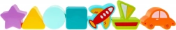 Verschiedene Ausschnitte und passende Teile (Stern, Quadrat, Dreieck, Kreis, Auto, Flugzeug, Boot) fördern die Formerkennung und die Feinmotorik.