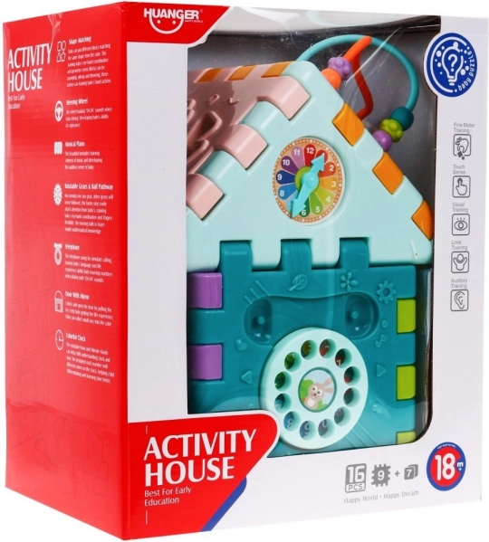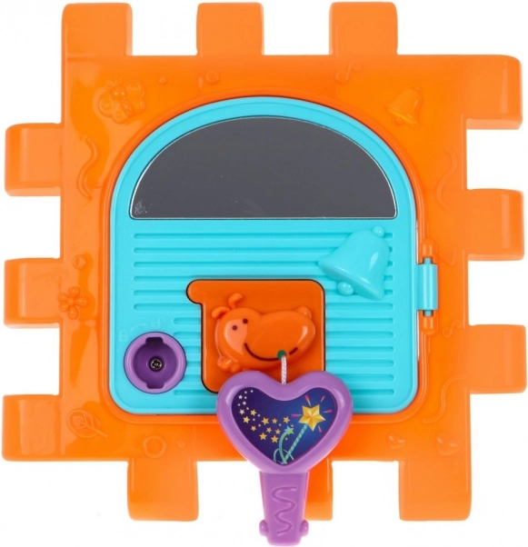 Dieses bunte Multihäuschen lässt sich zu verschiedenen Formen zusammenbauen oder zu einer flachen Spielmatte auseinanderlegen. Dank Licht- und Soundeffekten des Klaviers (Betrieb mit 3× AAA, nicht enthalten) werden Hören und Sehen gefördert, während die mechanischen Elemente – Lenkrad, Telefon, Türchen mit Schlüssel und Zahnräder – Feinmotorik und Koordination trainieren.