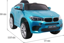 Das lizenzierte BMW X6M ist ein hochwertiges elektrisches Kinderauto mit realistischen Details, die dem echten Modell nachempfunden sind. Zwei Motoren (2×45 W), gespeist von zwei Batterien 2×6 V/7 Ah, bieten eine sanfte und zuverlässige Fahrt vorwärts und rückwärts mit zwei Geschwindigkeitsstufen (Quick/Slow). Weiche EVA‑Räder mit 26 cm Durchmesser und hintere Stoßdämpfer sorgen für Komfort auf Unebenheiten, während das sanfte Anfahren Kinder vor Ruckeln schützt.