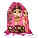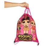 Auffälliges rosa Design mit LOL SURPRISE-Figuren und dem Schriftzug #SQUAD GOALS sorgt dafür, dass der Beutel Kindern lange Freude macht.