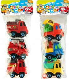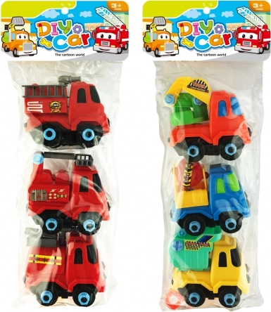 Schraubenautoset für Kinder, das drei verschiedene Modelle mit einer Länge von 10 cm enthält. Ideal für kleine Baumeister und Feuerwehrleute.