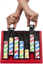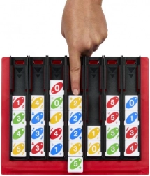 UNO Quatro vereint das Beste aus klassischem UNO und Vier-gewinnt-Strategie. Die Spielenden platzieren abwechselnd dreieckige oder quadratische Steine mit Zahlen und Farben in einen Schlitzrahmen und versuchen, eine zusammenhängende Reihe von vier derselben Farbe oder Zahl zu bilden. Die Spannung steigern spezielle Aktionen, mit denen sich Steine verschieben, vertauschen oder ganze Reihen verschieben lassen – ein idealer Mix aus Planung, Bluff und überraschenden Wendungen.