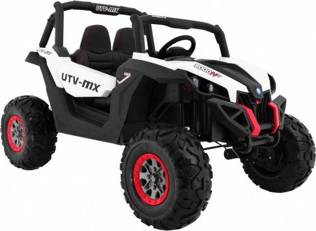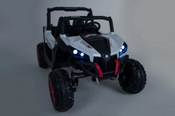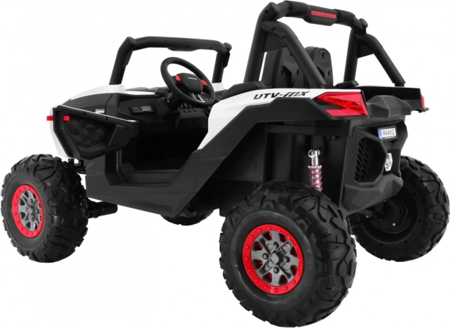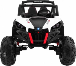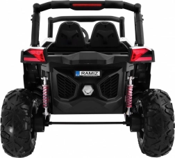 Der Buggy ist dank der separaten Federung (2× vorne, 2× hinten) mit einstellbaren Gewindestoßdämpfern auf eine stabile und komfortable Fahrt ausgelegt. Die großen EVA-Räder 35×15 cm dämpfen Unebenheiten ausgezeichnet und die hohe Bodenfreiheit von 23 cm hilft abseits befestigter Wege. Der Doppelsitz aus schwarzem, belüftetem Eco-Leder mit Gurten sorgt für Komfort und Sicherheit auch für zwei Fahrer.