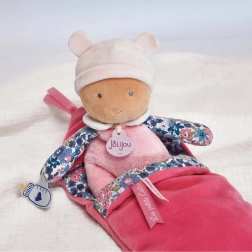 Entdecken Sie die Freude am Spielen mit dieser niedlichen Doudou-Puppe, die sorgfältig in eine rosa geblümte Decke eingehüllt ist. Ideal zum Beruhigen von Kindern und zur Anregung ihrer Fantasie.