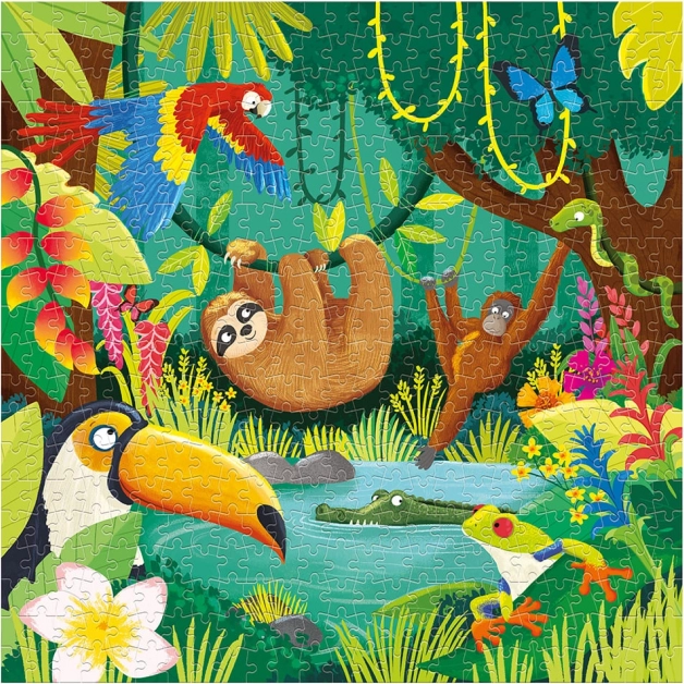 Unter den Kronen des Regenwaldes verbirgt sich eine Welt voller Geheimnisse – und Sie können sie Stück für Stück entdecken. Dieses hochwertige Familienpuzzle zeigt eine zauberhaft illustrierte Dschungellandschaft mit Faultier, Orang-Utan, Tukan und Krokodil. Dank des ausgewogenen Schwierigkeitsgrads eignet es sich hervorragend zum gemeinsamen Puzzeln von Kindern und Erwachsenen.