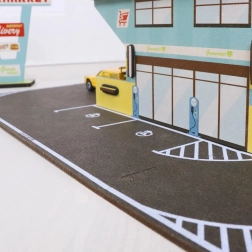 Ein Supermarkt mit Burger-Restaurant, Parkplatz und Beschilderung schafft eine authentische Szene, die Kinder ins Spiel zieht und ihre Fantasie anregt.