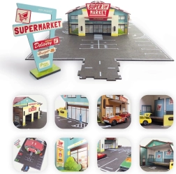 Mit diesem kreativen Bausatz errichtest du einen Supermarkt mit Burger-Restaurant, Parkplatz, Auffahrten und Ausfahrten sowie anschließenden Straßen. Die Teile lassen sich einfach verbinden, halten beim Spielen fest zusammen und bieten Kindern stundenlange fantasievolle Fahrabenteuer mit Spielzeugautos. Papp- und Holzelemente aus verantwortungsvoll gewonnenen Materialien sorgen für Robustheit und Umweltschonung.
