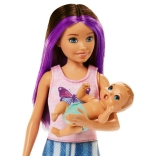 Die Skipper-Puppe mit violetten Haarsträhnen trägt ein filmisches Outfit und ist bereit für viele Geschichten rund um Fürsorge und sanfte Einschlafrituale. Dank zahlreicher Detail-Elemente ist das Set ein ideales Geschenk für Kinder ab 3 Jahren, Geschwister und kleine Babysitter, die die Welt der Barbie-Puppen lieben.