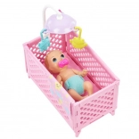 Enthalten sind ein rosa Bettchen mit Mobile, eine kuschelige Decke, ein Büchlein und ein kleiner Teddybär – alles für ruhiges Einschlafen und viele Spielideen.