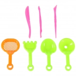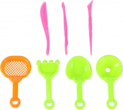 1 Kilogramm Sand bieten viel Material zum Spielen und Bauen von Sandburgen und -kuchen. Das Set enthält auch nützliches Zubehör wie ein Sieb, eine Schaufel, eine Harke und Modellierstäbchen.