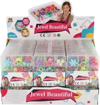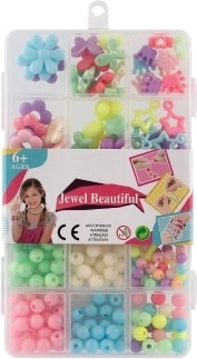 Das Set enthält verschiedene Formen und Größen von Perlen in leuchtenden Farben, die zur Gestaltung origineller Armbänder und Halsketten inspirieren.