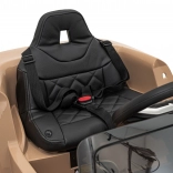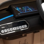 Die Bedienung ist dank Soft-Start und der Wahl von Vorwärts/Rückwärts mit 2 Geschwindigkeiten angenehm sanft. Elterliche Aufsicht gewährleistet die 2,4-GHz-Fernbedienung mit drei Geschwindigkeiten und Notstopp-Funktion. Das Audio-Panel bietet Wiedergabe über USB, Bluetooth, AUX sowie integrierte Melodien und eine Hupe am Lenkrad.