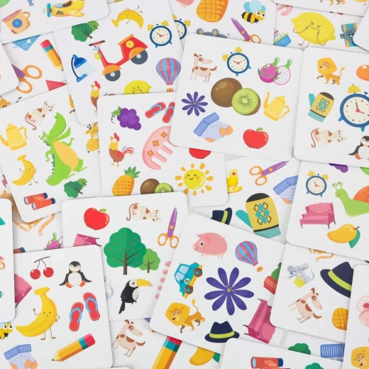 Die Karten sind groß, mit klaren, farbenfrohen Illustrationen auf fester Kartonpappe, sodass sie auch häufiges Spielen aushalten. Das Spiel fördert visuelle Wahrnehmung, Konzentration und schnelle Orientierung. Ideal für 2 Spieler, lässt sich aber leicht für mehrere Spielvarianten anpassen.