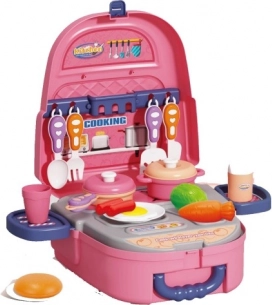 Küchenset in praktischer Verpackung – lässt sich leicht verstauen und wie ein Rucksack tragen. Das Set enthält 22 Stück Küchenzubehör: Besteck, Töpfe, Deckel, Spiellebensmittel und weiteres Zubehör. Fördert die koordinierte Entwicklung von Körper und Gehirn und hilft dem Kind, beim Spielen Augen, Hände und Gehirn zu koordinieren.