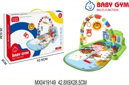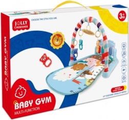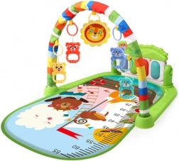 Die Spielmatte hat fröhliche Farben und verschiedene Materialien. Das weiche Material sorgt für ein angenehmes Gefühl. An dem Spielbogen hängen fröhliche, bunte Tierchen. Für Kinder ab 3 Monaten. Teil der Matte ist ein interaktives Klavier.