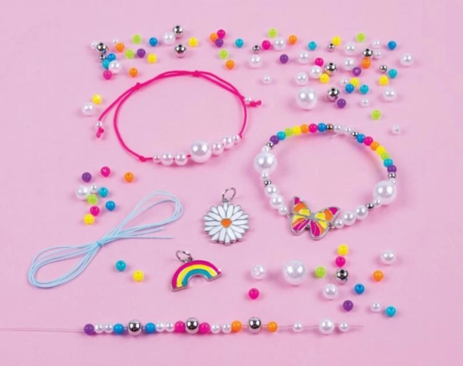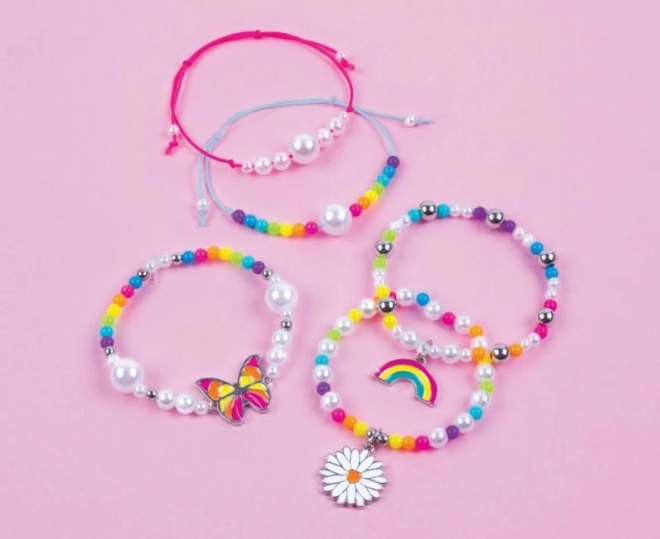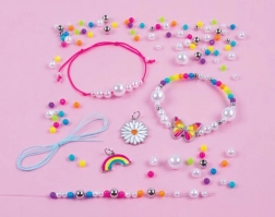 Es enthält alle notwendigen Komponenten inklusive Perlen, Schnüren und Anhängern zur Herstellung von fünf einzigartigen Armbändern.