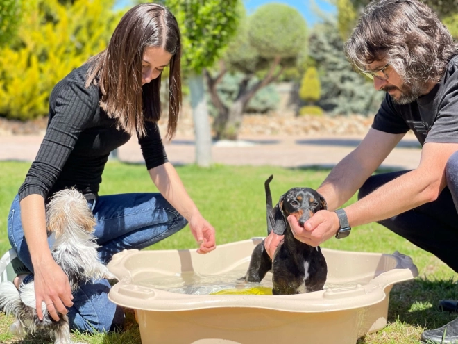 Das durchdachte Design mit sicheren, abgerundeten Kanten verhindert Anknabbern, während praktische Drainagerillen ein Überlaufen vermeiden. Der Pool ist stapelbar, um Platz zu sparen, und dank des Griffs lässt er sich bequem überallhin mitnehmen – in den Hof, auf die Terrasse oder auf Reisen mit Tieren.