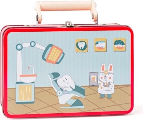 Dieses stylische Kinder-Zahnärzte-Set bietet alles, was man für die ersten Spiele in der „Zahnarztpraxis“ braucht. Die Holzinstrumente liegen angenehm in der Hand, sind sicher und langlebig, die Metallbox hält zu Hause wie unterwegs alles übersichtlich beisammen. Ideal zur Förderung sozialer Kompetenzen und zum Abbau von Angst vor dem Arztbesuch.