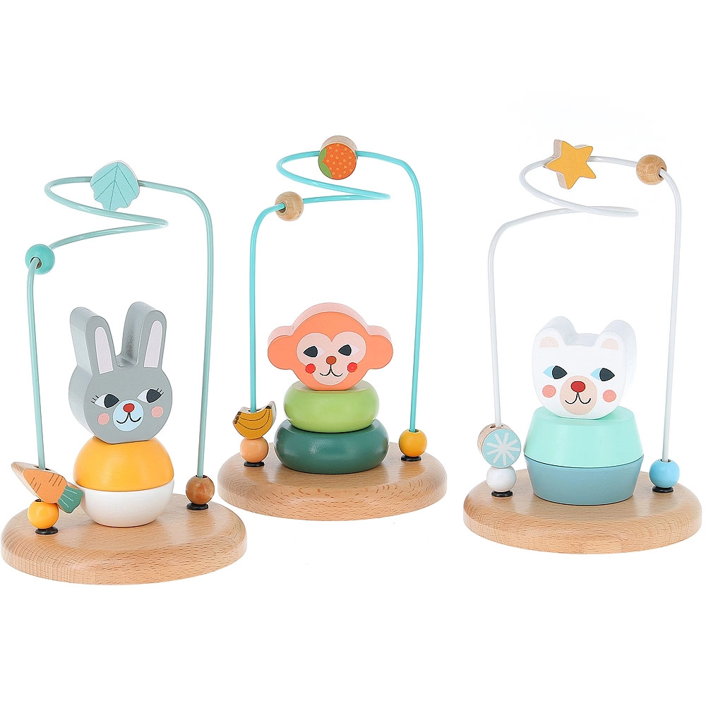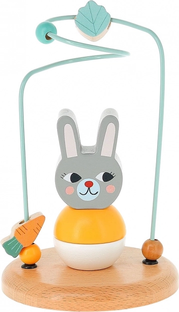 Dieses Holzlabyrinth mit Metallbahn und Hasenfigur bietet eine spielerische Aktivität, bei der Kinder Perlen und Formen (Möhre, Blatt) auf einer gewellten Strecke bewegen. Das Spielzeug fördert Feinmotorik, Konzentration und Geduld und ist dank des stabilen Holzsockels zugleich sicher und standfest.
