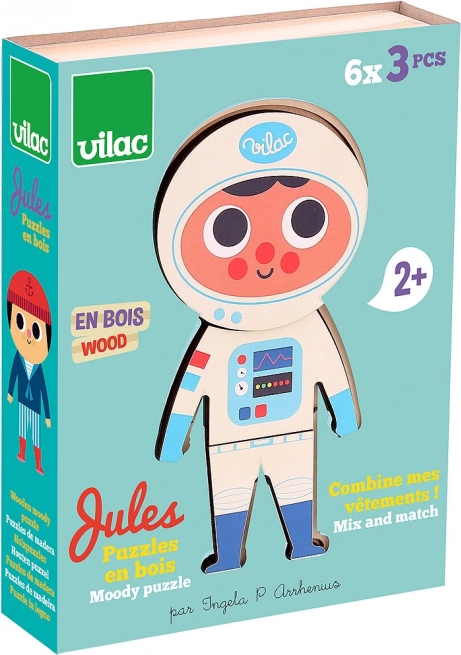 Das Vilac Anziehpuzzle Jules ist ein Holzspielzeug, ideal zur Förderung der Motorik, Beobachtungsgabe und Kreativität von Kindern. Es enthält 18 Teile, die es ermöglichen, insgesamt 6 Grundoutfits zu gestalten. Kinder können die einzelnen Teile mischen und so eine unendliche Anzahl von Kombinationen erstellen: