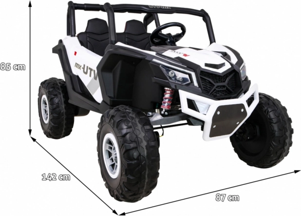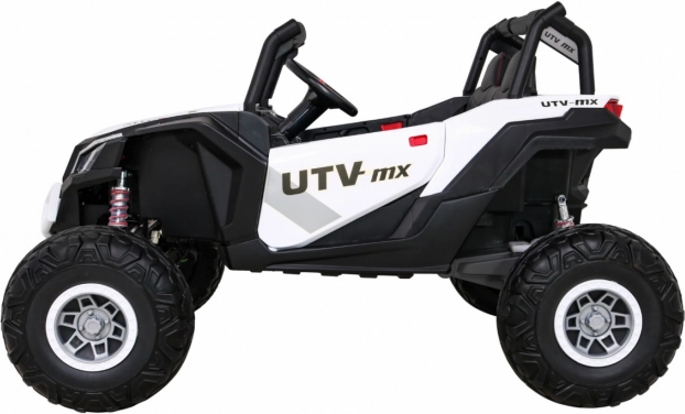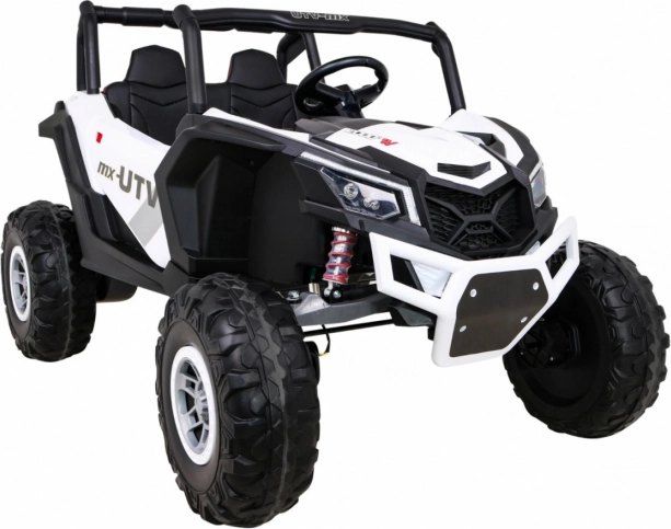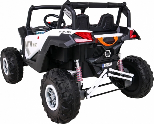 Erleben Sie Offroad-Abenteuer mit dem Kinderfahrzeug UTV-MX. Vier Motoren 4×60 W, eine hohe Bodenfreiheit von 29 cm sowie Federung vorne und hinten sorgen für souveränes Überfahren von Unebenheiten. Der langsame Softstart schützt den Komfort des kleinen Fahrers und erhöht die Sicherheit.