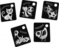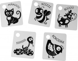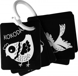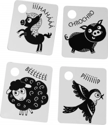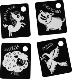 Unterstützen Sie die Entwicklung Ihres Babys mit kontrastreichen schwarz-weißen Karten, verpackt in Sets zu 9 Stück aus hochwertigen tschechischen Materialien. Jede Karte hat eine Aufhängöffnung, und im Set ist ein Kunststoffring zum einfachen Verbinden enthalten. Die Karten stimulieren das Sehen, fördern die Feinmotorik und die natürliche Neugier der Kinder, einschließlich des Kennenlernens von Tieren.