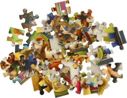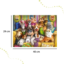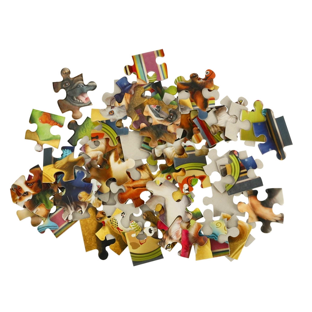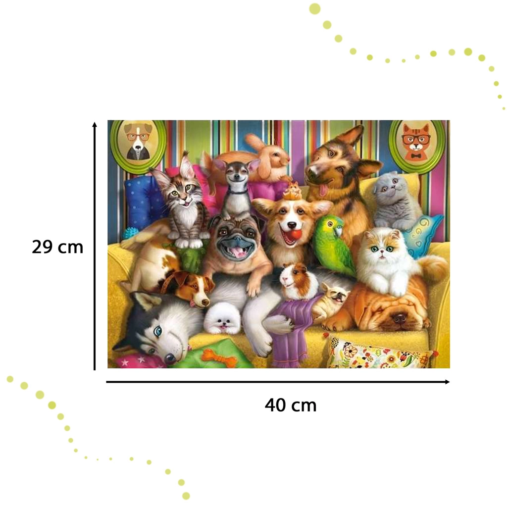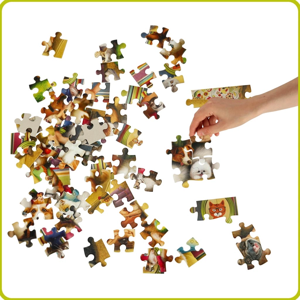 Die bunte Szene mit Hunden, Katzen und einem Papagei motiviert Kinder zum Puzzeln und bringt Freude am fertigen Bild.