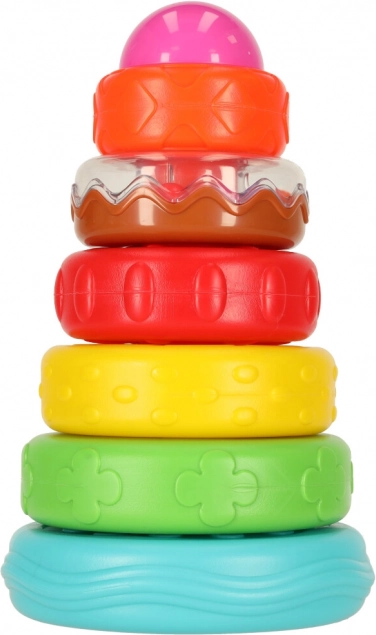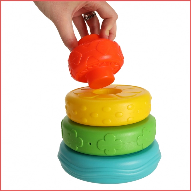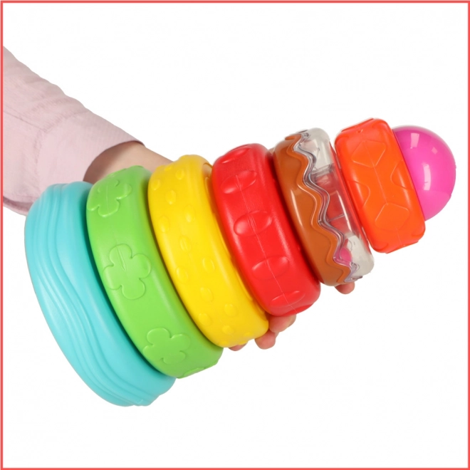 Das Bauen des Turms und das Aufstecken der Ringe stärkt die Feinmotorik der Finger und die Augen-Hand-Koordination.