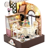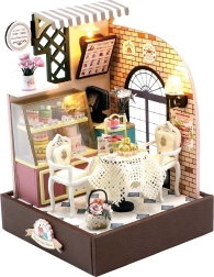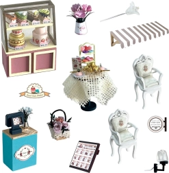 Gestalten Sie Ihre eigene gemütliche Konditorei mit miniaturisierten Tischen, Stühlen und einer Dessertvitrine. Das Set wird zerlegt geliefert, enthält eine detaillierte Anleitung sowie praktische Werkzeuge für den einfachen Zusammenbau. Das fertige Modell wirkt wie ein realistisches Diorama – ideal für Liebhaber von Miniaturen und stilvollen Dekorationen.