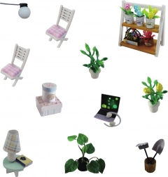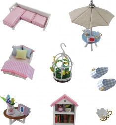 Das Miniaturmodell bietet ein detailliertes Interieur mit Möbeln und Dekorationen, die einem echten Haus nachempfunden sind.