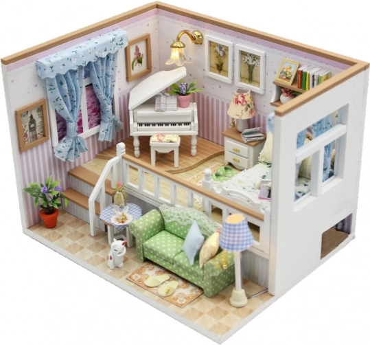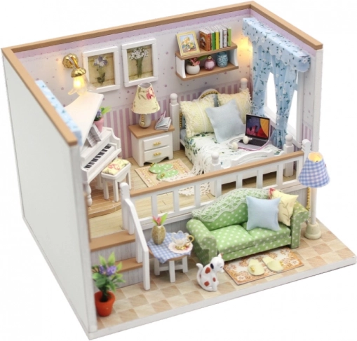 Gestalten Sie Ihr eigenes Miniatur-Interieur voller realistischer Details – ein gemütliches Sofa mit Kissen, ein elegantes Klavier, ein Bett mit Textilausstattung, Lampen, Regale und feine Dekorationen. Die integrierte LED-Beleuchtung sorgt für eine behagliche Atmosphäre und verwandelt Ihr Werk in eine einzigartige Dekoration für Regal oder Schreibtisch.