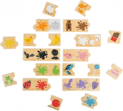 Entdecken Sie ein clever gestaltetes Lernspiel, bei dem Kinder farbgleiche Dreiergruppen bilden – zum Beispiel brauner Bär, Schokoriegel und brauner Klecks. 30 robuste Holzteile in 10 kräftigen Farben laden zum wiederholten Spielen ein und fördern ganz natürlich das Lernen der Farben sowie das Benennen von Objekten.