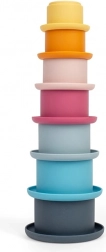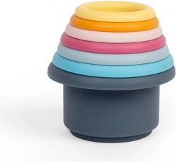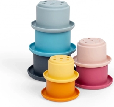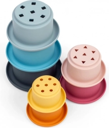 Farbiges Set aus sieben stapelbaren Bechern aus 100 % lebensmittelechtem Silikon ohne Kunststoffe. Ideal für die Badewanne, im Sand und zu Hause. Gemusterte Öffnungen im Boden erzeugen einen Wasserfalleffekt; Kinder trainieren Feinmotorik, Hand-Auge-Koordination und Farbwahrnehmung. Das Material ist robust, ungiftig, leicht zu reinigen und spülmaschinengeeignet.