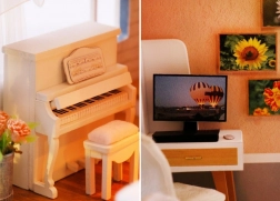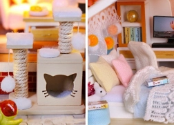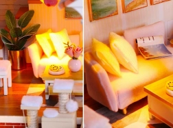 Das Modell besteht aus einer Kombination aus Holz, Papier und Stoff, wodurch es hochwertig und realistisch wirkt. Das Interieur wird von Miniaturmöbeln und Dekorationen geschmückt, die die Atmosphäre eines kleinen Zuhauses unterstreichen. LED-Lichter (betrieben mit 2× AAA, nicht enthalten) verleihen der Szenerie Lebendigkeit und sorgen abends für eine angenehme Stimmung.