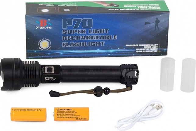 - Taschenlampe P516‑P70, 2× 26650‑Akkus, USB‑Kabel, Originalverpackung