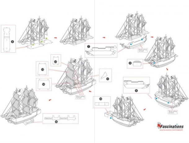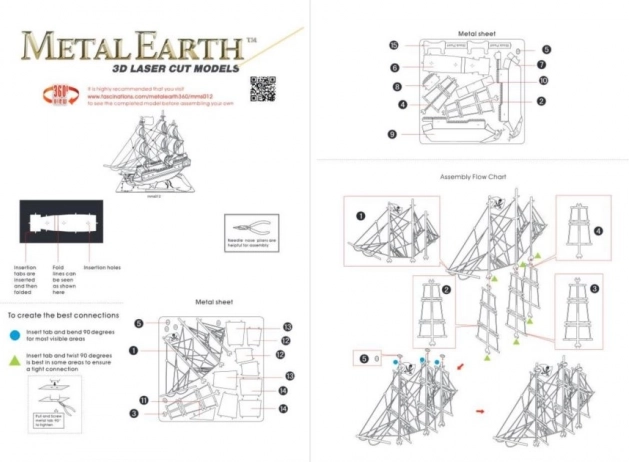 Trennen Sie die einzelnen Teile aus den Metallblechen heraus; bei Bedarf verwenden Sie kleine Seitenschneider (nicht enthalten). Die Teile werden mithilfe von Laschen und entsprechenden Öffnungen miteinander verbunden. Biegen Sie die Lasche mit einer kleinen, spitzen Zange (nicht enthalten) um und fügen Sie nach und nach alle Verbindungen zusammen, bis ein äußerst realistisches Meisterstück entsteht!
