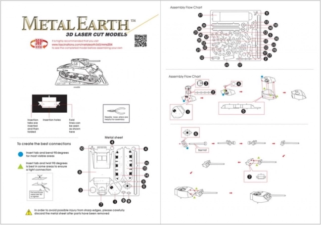 Entnehmen Sie die einzelnen Teile aus den Metallblechen. Bei Bedarf verwenden Sie einen kleinen Seitenschneider (nicht enthalten). Die Teile werden mittels Verschlüssen verbunden, die aus einer Lasche (Haken) und einer Öffnung bestehen. Biegen Sie die Lasche mit einer kleinen, spitzen Zange (nicht enthalten) um und verbinden Sie nach und nach alle Verschlüsse, bis ein äußerst realistisches Meisterstück entsteht!