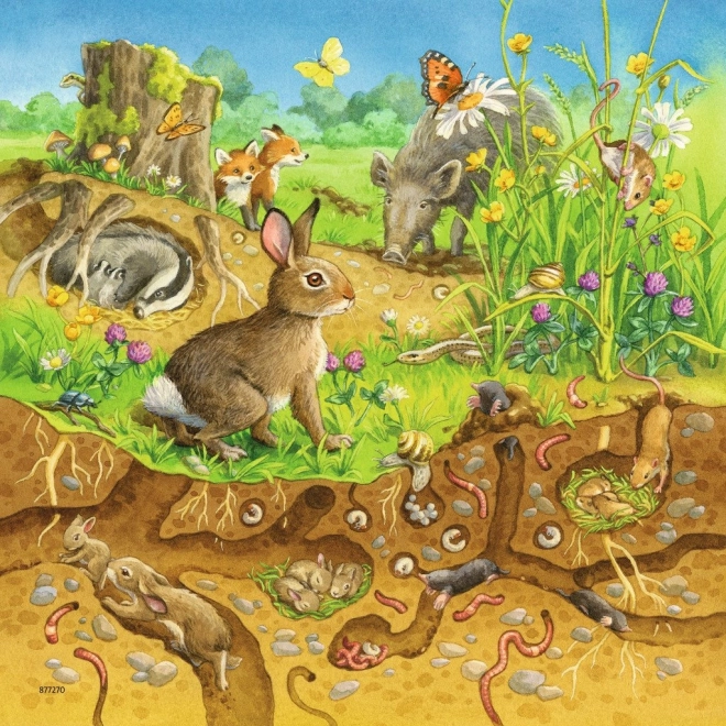 Dieses Puzzle bietet einen Blick auf Waldtiere und deren Verhalten, einschließlich Kaninchen, Füchsen und Wildschweinen in ihren natürlichen Behausungen.