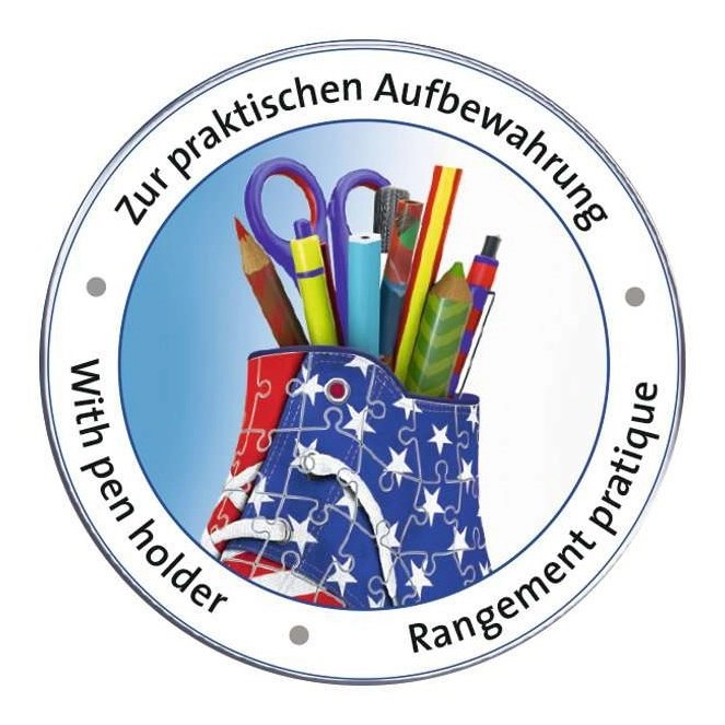 Geniale Kombination für Sneaker-Fans und Puzzleliebhaber! Setzen Sie ein 3D-Puzzle in einer originellen Form zusammen, das Ihren Schreibtisch zum Leben erweckt. RAVENSBURGER hat 3D-Sneaker entwickelt, die sich zum Beispiel als originelle Stiftehalter für Kugelschreiber, Buntstifte oder Pinsel verwenden lassen. Spezielle gebogene oder biegsame Teile, die exakt an ihren Platz passen, ermöglichen den Bau eines Design-Sneakers mit dem Aufdruck der amerikanischen Flagge, der sehr realistisch wirkt. Die Teile bestehen aus robustem Kunststoff und garantieren hervorragende Stabilität. Der Sneaker hält ganz ohne Kleben. Lieferumfang: 108 nummerierte Puzzleteile, 4 Zubehörteile und eine Anleitung. Der in der Abbildung gezeigte Inhalt des Sneakers ist nicht im Lieferumfang enthalten. Größe des fertig zusammengesetzten Puzzles ca. 21,4 × 13,5 cm