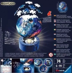 Dank der Nachtlicht-Edition von Ravensburger kann auch Ihr Kind eine bezaubernde leuchtende Kugel mit Weltraum-Motiv besitzen. Das Puzzle ist nicht nur wegen der einfachen Handhabung sehr beliebt, sondern auch wegen seiner Stabilität. Zum Zusammenbau benötigen Sie keinen Kleber; die speziell gefertigten, gebogenen Teile rasten einfach ineinander und behalten ihre Form. Es kann nach dem Bild oder nach Zahlen zusammengesetzt werden – die Kunststoffteile sind auf der Rückseite nummeriert. Der Durchmesser des Puzzleballs beträgt 13 cm. Verpackungsinhalt: