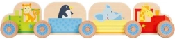 Bauen Sie Ihren ersten Zug mit zwei Lokomotiven und Waggons, die Tiere auf einen Ausflug mitnehmen. Sicheres Spielzeug aus massivem Holz, ideal für Kinderhände.