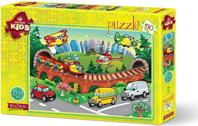 Bereiten Sie Kindern Freude mit einem farbenfrohen Puzzle zum Thema Verkehr. Das Bild mit Autos, Bussen und weiteren Fahrzeugen unterhält und fördert gleichzeitig ihre Fähigkeiten. Dank der 50 Teile ist das Zusammensetzen angemessen anspruchsvoll und eignet sich für kleine Einsteiger.