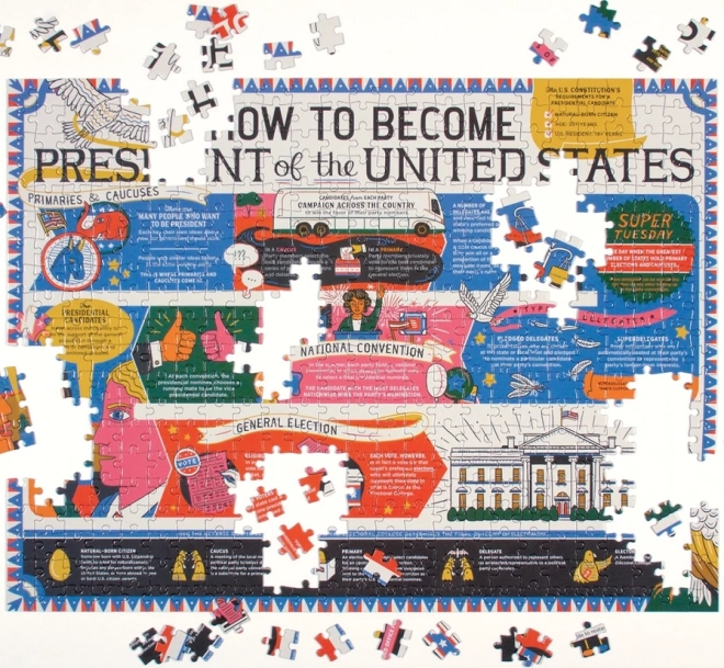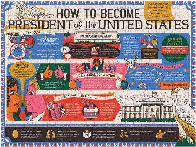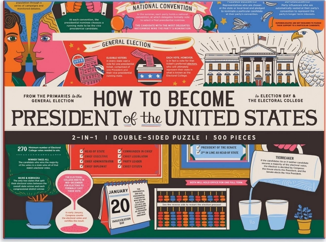 Dieses beidseitige Puzzle der Marke GALISON bietet doppelten Spaß. Eine Seite ist glänzend, die andere matt – das erleichtert die Unterscheidung der Motive und erhöht den Komfort beim Puzzeln. Das Thema führt Sie durch die Meilensteine der US-Präsidentschaftswahlen – von den Vorwahlen über die Nominierungen bis zur finalen Wahl.
