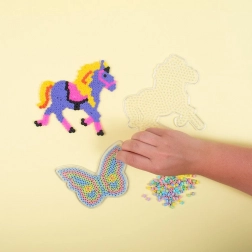Gestalten Sie farbenfrohe Bilder aus Bügelperlen mit den praktischen PLAYBOX-Steckplatten. Das transparente Material ermöglicht es, eine Vorlage unter die Platte zu legen (nicht im Lieferumfang enthalten) und bequem danach zu arbeiten. Das Set enthält zwei beliebte Formen – Schmetterling und Pferd – die kleine wie große Kreative begeistern.