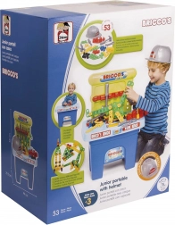 Tragbarer Arbeitstisch für Kinder, ausgestattet mit Helm und 53 Teilen für kreatives Spielen. Einfach zu transportieren und ideal für kleine Baumeister.